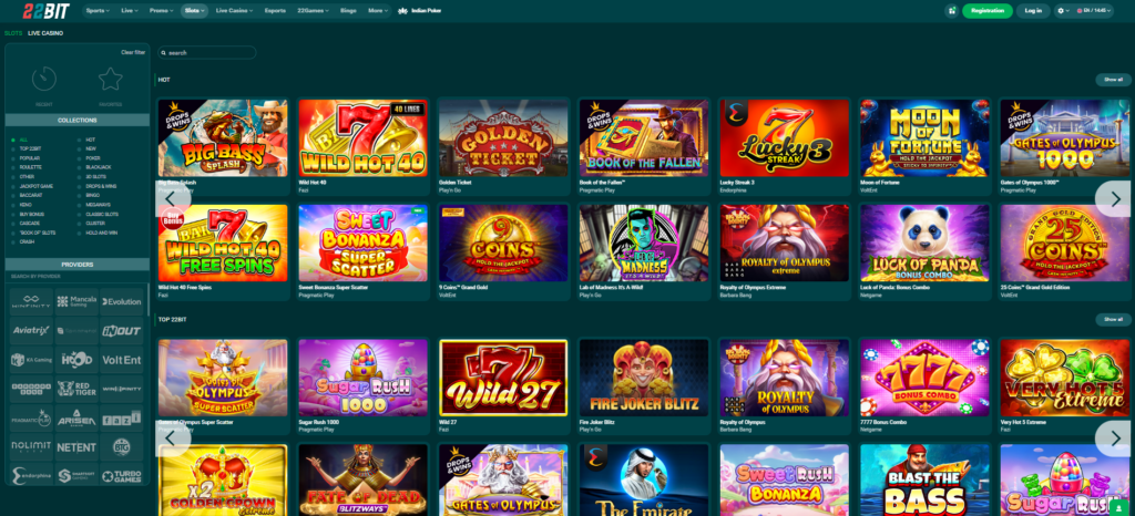 Како што и претходното спомнавме, слот изборот во 22Bit е навистина импресивен. Тука може да најдете слотови од многу познати и реномирани провајдери, но и од помали компании кои сакаат да се пробијат на пазарот. Во однос на темата, достапни се класика слотови, овошни, мистерични и со посебни приказни. Треба да се нагласи дека групирањето им е одлично, па во зависност од вашето барање, многу лесно може да го најдете посакуваниот слот.